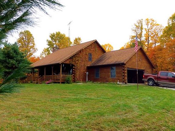 Beautiful log cabin home on 40 acres of woods and pasture. The house features 3 large bedrooms, 2.5 bathrooms, a cozy family room with wood burning fireplace, screened in porch and extra large 2 car garage. The master is on the main level and has a newly remodeled wheel chair accessible shower. Exterior features include a brand new roof (Aug 2015) barn, 3 acre lake full of bass, catfish and bluegill, with newly improved dock/pier as well as another pond. The property is 60/40 fields vs. woods. 5 miles from the highway, it's the perfect combination of privacy and seclusion while still providing easy access to amenities. Seller is offering a $5000 allowance to upgrade carpet and kitchen appliances!