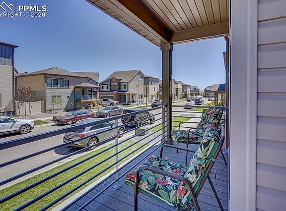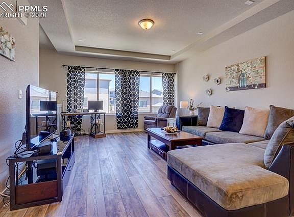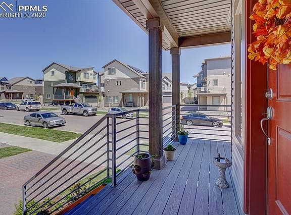 WELCOME HOME to beautifully maintained 2019 bi level carriage home in Banning Lewis Ranch with many builder upgrades! The upper level is bright and open, the living room is wired with surround sound and opens to to kitchen features beautiful backsplash, staggered cabinets with crown molding, stainless steel appliances, Quartz countertops, large island with counter bar, extra large pantry. The master bedroom has walk in closet and adjoined full jack n jill full bath. The lower level has bedroom and family/flex room with walk out to back patio.Yes this home is better than new build, it has all the upgrades, including all blinds and A/C and many, many upgrades!You are conveniently located to hospitals, parks, neighborhood schools, dog park, water park, garden area, tennis courts, acres of hiking/walking trails, schools, the Powers Corridor (and all the amenities you will find there) and so much more. Peterson and Shriever AFBs are a short commute.