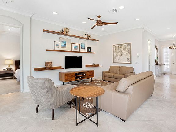 Sophia model with extended covered/screened patio with Travertine marble pavers and a partial lake view. Approximately $70,000 in builder and after market upgrades including accordion storm shutters, screened entry, 20+ additional high hats, 20x20 cream tile on the diagonal, California closets, upgraded kitchen and bath.....and more. HOA Fee includes lawn care, alarm monitoring, phone, cable and internet. Please call for a full list of upgrades. 3rd bedroom is a den.