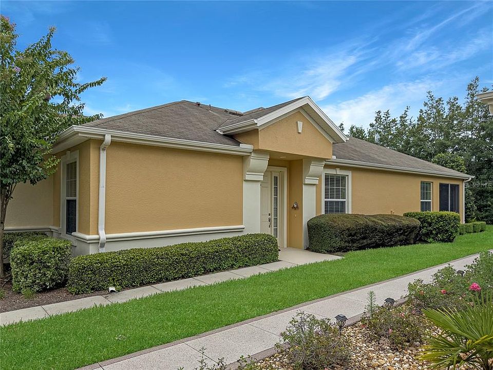Alexander Villa with 2 bedrooms, 2 baths, flex room and 2 car garage. The charming home features an open floor plan and new luxury vinyl flooring throughout in 2022. The kitchen has stainless steel appliances, new refrigerator, new microwave, new disposal and new granite countertops, large kitchen island, recessed lighting and cafe area. Separate dining area. The living room has ceiling fan and sliding glass doors leading to the lanai. The primary bedroom has ceiling fan. The primary bath has shower, solid surface countertops and ceiling fan. Walk-in closet. Guest bathroom has tub with sliding glass doors and solid surface countertops. Flex room/den has glass French doors. Laundry room has upper cabinets, sink and folding counter. Large screened lanai and herringbone pattern paver lanai with landscaping and private backyard. New A/C in 2022. New Hot Water Heater, Water Softener and Garage Door Motor in 2023. Maintenance Free Living! Come see this home today!