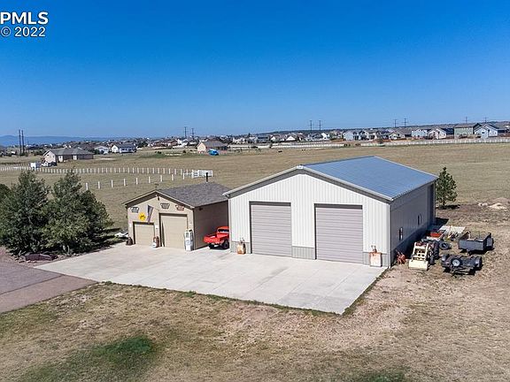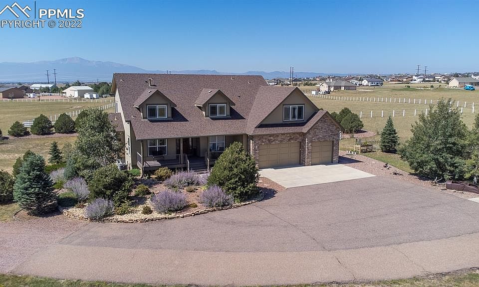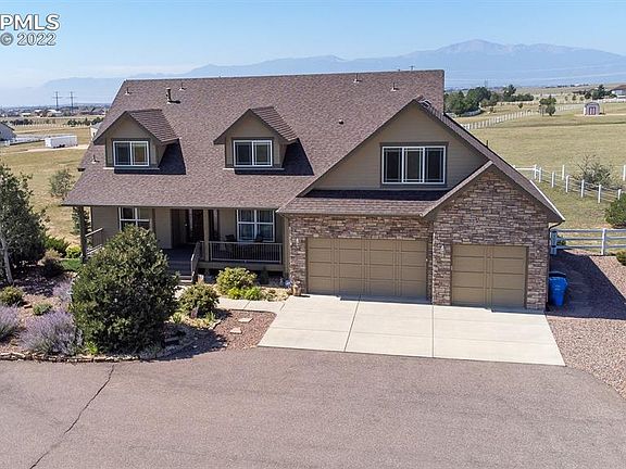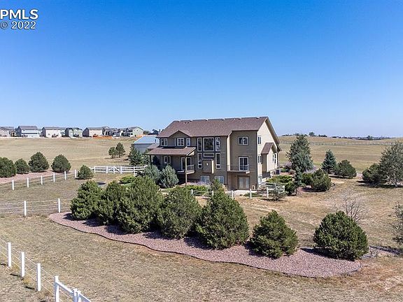 Welcome home to this expansive custom home on over 7.5 acres with a private well, detached shop, and a HUGE pole barn! This light and bright home will not disappoint with excellent craftmanship throughout and all the features that you would put on your wish list including views from literally every window. Roll up the long private drive to this large property conveniently located in the heart of the Falcon community of Elkhorn Estates. The front of the home invites you right in with a large covered porch with composite decking and plenty of room to take in the sunrises overlooking the meadows. The moment you enter the home you will notice the custom finishes, from beautiful woodwork and iron, vaulted ceilings and expansive windows. An office is to the left of the entry and the formal dining room with recessed cove lighting and french doors is located to the right. Straight ahead you will find the great room and the large kitchen featuring all stainless steel appliances, custom stone countertops, walk in pantry, large island with breakfast bar, eat in kitchen area and butler's pantry. Walk out to the huge covered deck perfect for entertaining and capturing those mountain views for miles! On the opposite side of the great room there is a secondary bedroom suite with a full bath. The main level also includes a large mudroom with amazing built in storage & oversized laundry room. A beautiful open staircase takes you to the upper level where you will find the primary bedroom suite featuring a beautiful 5 piece bathroom, double vanity, a large walk-in closet and a jetted soaker tub. In addition, 4 generous sized secondary bedrooms with great closets, 2 with a shared ensuite bathroom. One oversized bedroom would be ideal as a flex space for many purposes. The garden level and walk out unfinished basement is gigantic with possibilities galore. Last but not least the property has a large detached garage/shop and a 2688 SF pole barn with concrete floor and multiple RV doors.