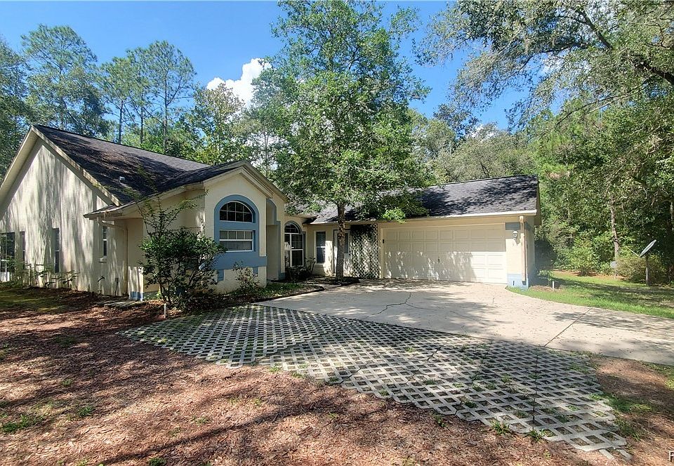 Very Nice Home on Private wooded 1.29 acres in the desirable Woodlands of Rainbow Springs with a detached one car garage/workshop with electric and AC. The home features 1971 square feet of living area under AC and includes three bedrooms and 2.5 bathrooms. The Master Bedroom features tiled floor, double sinks, a Garden Tub, glass enclosed shower, high ceilings, a ceiling fan and Skylights (there are eight skylights strategically placed around the home). The Kitchen is very light and airy and opens up into a Circular Dining area. Two Bedrooms and the living room all have wood laminate flooring and there is a large Bonus Room with vinyl flooring that would easily convert into a Fourth Bedroom or Large Office Space and is also accessible via the Two-Car attached Garage. The Laundry Room also includes a 1/2 bathroom. There are Ceiling fans and walk-In Closets in every Bedroom. If you are searching for a private home in a quiet subdivision located minutes from the Private Community Rainbow River Park as well as minutes from the small town of Dunnellon. Dunnellon, FL is located just two hours from all major theme parks, international airports and cruise ports, and less than an our from Gainesville, the University of Florida and World Class Healthcare at Shands Hospital.