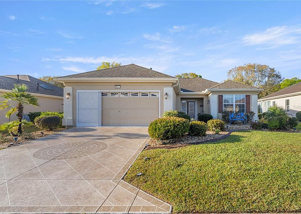 Don't miss out .. Immaculately.. Loaded!!! Stunning well loved and gently lived in 2/2 plus small office Amelia in Del Webb's Spruce Creek Golf & Country Club,an exclusive 55 and better community on a semi private lot, just a short walk to the state of the art fitness center. This home has to many upgrades to list. You won't believe your eyes. From the moment you open the front door.... you know you are Home...! Inviting spacious living room detail that went into every aspect of this home, beginning with the designer painted/textured drive and walkway, clean, mature landscape with freshly sealed concrete curbing, newer carriage lights, HVAC 2019, WATER HEATER 2024 , NOVA water FILTRATION SYSTEM 2024,, Irrigation system installed 2023, NEWLY screened in garage with plenty cabinets. As you enter the front door, take notice of the leaded glass entry and beautiful tile foyer, entire home has crown molding throughout, interior painted just 4 years ago. The great room has an electric fireplace for those chilly winter mornings and evenings and luxury vinyl, wood look flooring. The kitchen is been nicely updated with solid wood light maple cabinets with crown molding and glass inserts, as well as newer graphite appliances, granite counters that continue up the backsplash and recessed lighting. The master bedroom also boasted newer luxury vinyl flooring, a bow window for added space and light and a nice size ensuite with raised dual vanity and new shower door. Home has updated plumbing and ceiling fixtures throughout. The guest bedroom is a comfortable size with newer carpet, and the guest bath has also been updated with a raised light maple vanity and granite counters. There is a small office space with built in cabinets leading to the garage that has pebble flooring and a washtub. See yourself sitting on the semi private South west facing lanai, also a pebble finished floor, while enjoying the added space with birdcage and open patio for grilling. Newly planted orange tree. See this home today for the entire list of updates and upgrades.Welcome HOME...! Don't wait....Call today for your personal viewing.