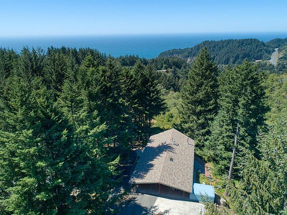 OCEAN VIEWS! Imagine ending everyday with breathtaking sunsets in your Chalet-style & secluded home. Enclosed patio on main level. Fabulous kitchen with granite countertops, seal granite sink, dual ovens & 36" induction cooktop. All bedrooms feature en-suite & master has Brazilian cherry floors. Bottom level is its own separate living space, w/ full kitchen, 2bed/2bath & separate access. 2 shops, 1 w/RV parking, electricity & bathroom.