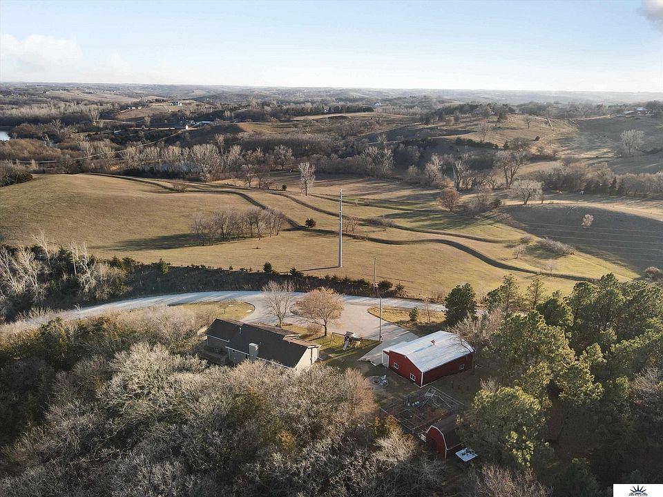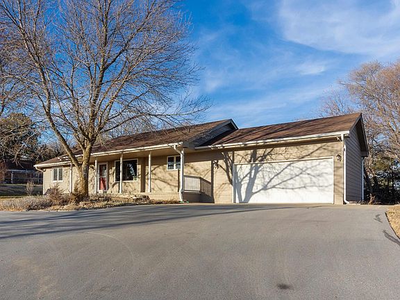 Wooded Acreage with picture perfect views of the Great Plains rolling landscape. The circle driveway leads to the walkout ranch style home with 4 bedrooms, 3 bathrooms and plenty of storage. Fresh Paint! Explore the trails in your private wooded oasis. LARGE Outbuilding with 2 oversized doors for all your projects. Shop area inside the outbuilding with two sinks, heat, water heater and bathroom. Additional LVP flooring in shop to finish off the kitchen and mudroom included. Asphalt driveway in 2022. Firepit and shed for chickens, gardening, etc.. Public Water. Water softener and water heater 2017. All appliances stay! Laundry Room is currently in basement but can be moved back to main level. Pre-inspected!