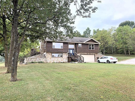 Located north of Bolivar and sitting on 19.63 acres m/l this rustic, split level home sits high on a hill with a breathtaking view of the Ozarks! This property is conveniently located between 83 Highway and 13 Highway on a chip and seal road. The winding driveway is lined with scattered mature shade trees and takes you past the stocked pond up to the home and 30 x 40 shop. The exterior of the home is cedar and stone and there is a large side and back deck perfect for outdoor entertaining. (Fun Fact....there is a trampoline built into the back deck!) Inside you will find a semi-open floor plan. The large living room has hardwood floors, vaulted ceiling, stone fireplace and oversized window to take advantage of the view! The kitchen has gorgeous cabinets, stainless style appliances and the dining area leads to the back deck. The master bedroom is large enough for king sized furniture and the master bath has double sinks and walk-in shower. Two spare bedrooms, a spare bath and laundry complete the main floor. The lower level has a large family room, full bath, storage room and two car garage. Let's head back outside and we will find the 30 x 40 shop with 16' sidewalls, insulation, 220 electricity, central heat and air, 14' entry door and a 10 x 30 lean-to on the back. You will also find a chicken house and garden shed and trails in the woods. This is a great find so close to Bolivar. Call today to make an appointment to see it....you will love the unique character and will be excited to make it your own.
