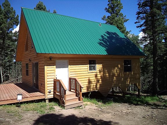 new amish built log cabin (2015), 2bed,1bath,loft, 1032 sq feet, open floor plan, 20ft ceiling, large windows on gable end, 10 by 24 ft deck, maple hardwood floors, whirlpool stainless steel appliances, wood burning stove, washer/dryer hook-up. beautiful tree covered lot 1.1 acres. principal & interest payment $483.38 with 25% down at 4% interest. new beige carpet--all neutral colors. opens to meadow with views at rear of lot --common area ground. ( in forbes park between Walsenburg & Alamosa)