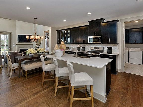 STUNNING Taylor Morrison End Unit Model Townhome for sale! Lovely upgraded home with all of the top finishes! Gorgeous open kitchen with quartz, black cabinetry, double SS sink on the large island with barstool seating. HUGE laundry room off the kitchen. 2 story Family room full of windows with a corner fireplace. 3BR and 3.5BA -- First Floor Primary Suite that opens to the covered back porch and has a large bathroom with walk in shower! 2 Bedrooms upstairs with their own full bathrooms and a large loft! Love the furniture? You can purchase it!! Large corner lot, and FABULOUS HOA amenities within walking distance. Priced under $600K!