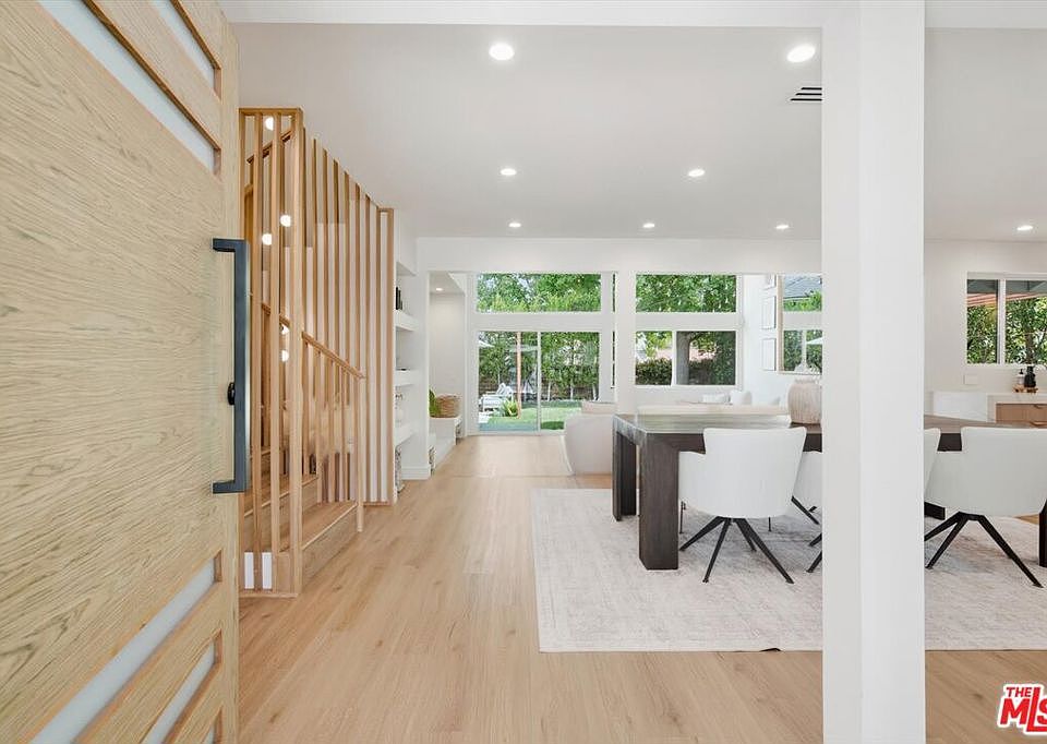 Positioned on a corner lot in the coveted Village Homes neighborhood, this reimagined 4-bedroom, 3.5-bath residence perfectly balances modern design with California comfort. Blending clean, contemporary lines with mid-century warmth, every inch of this home has been thoughtfully curated to create a seamless indoor-outdoor flow ideal for both everyday living and entertaining. Step through the dramatic walnut front door into an airy, open-concept main level where natural light pours through floor to ceiling windows and doors, illuminating the designer finishes throughout. The kitchen, dining, and living spaces connect effortlessly anchored by a sculptural floor-to-ceiling clay tile fireplace and custom white oak staircase crowned with an 18-foot handcrafted chandelier. Sleek custom cabinetry, floating wood shelves with under-lighting, and stainless steel appliances lend the kitchen a timeless yet modern edge, while the powder bath offers a bold, moody counterpoint with reclaimed wood, smoked mirrors, and designer fixtures. Two primary suites one conveniently located on the main level and another upstairs offer flexibility for multi-generational living or a luxurious guest retreat. Each suite features spa-like bathrooms with bespoke tile work, double vanities, and spacious walk-in showers. Two additional upstairs bedrooms share a beautifully appointed Jack-and-Jill bath. Outdoors, the backyard has been transformed into a serene private retreat designed for relaxation and entertaining. A new pergola shades the dining area and BBQ, while stone hardscaping, expanded planters, and a tranquil fountain set the tone for quiet evenings under the string lights. The cozy seating area complete with umbrella and lush greenery makes this the perfect setting for wine nights, dinner parties, or peaceful afternoons in the sun. The side yards have been refreshed with stone pathways, offering a clean, cohesive aesthetic from every angle. Located just moments from Westlake's shops, dining, and scenic walking trails, and within the highly sought-after Village Homes community featuring a pool, kiddie pool, tennis courts, and clubhouse. This home is the complete package: modern sophistication, functional design, and the effortless Westlake Village lifestyle.