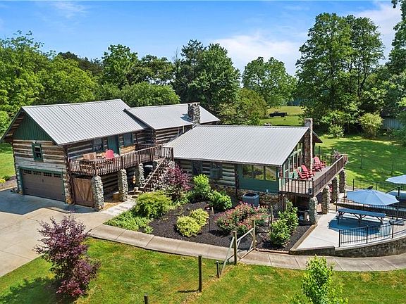 Beautiful log home on 2.96 Acres! Living room has rock woodburning fireplace,exposed beams,Kitchen is stunning w/custom cabinetry,island,all appliances,granite,slate backsplash,pantry,Huge sunroom. Covered porches, 2 concrete patios, circle driveway,firepit, multiple large decks,Bonus room on upper, bonus room on lower. 2 car garage on main, storage rooms, loft area, 4 stall building/shop/storage, 2 stables,chicken coop,rabbit cages,walkway all around house and so much more!