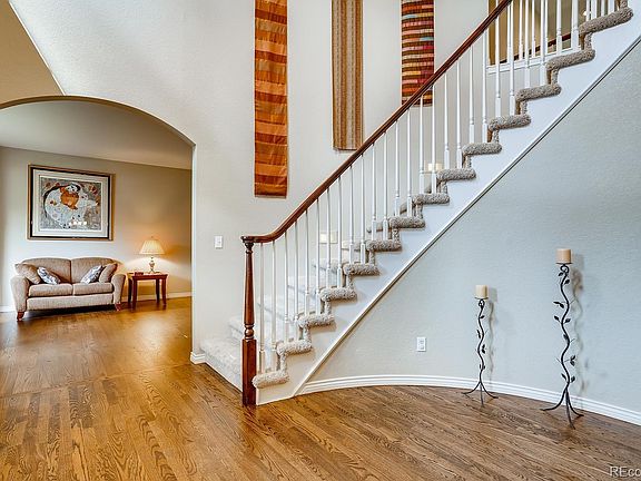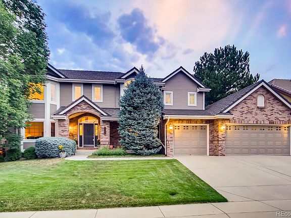 Exquisitely executed, this expansive Huntington Pines home will take your breath away from the moment you walk in the front door! Thoughtful design and quality craftsmanship combine in a pristine, open-concept interior with warm, easy-flowing living spaces appointed with new hardwood flooring, vaulted ceilings, and luxurious custom finishes. A gourmet's delight, the kitchen showcases granite countertops and stainless steel Jenn-Air appliances with a double oven and gas range. In the adjoining breakfast nook, glass doors open up to the backyard patio, allowing for seamless outdoor entertaining. Upstairs, find a private owner's suite equipped with a spa-inspired en suite bathroom with heated flooring and a walk-in closet with a custom organization system. The finished basement hosts a game room, media room, recreation room with wet bar, plus a versatile bedroom and ¾ bathroom. Completing this spectacular property is a private backyard with a paver patio and manicured lawn, offering ample space for outdoor activities. Updates completed since 2017 include fresh carpet, new stone-coated steel roof, ceiling fans, fresh exterior paint, smart thermostat, smart irrigation system, granite bathroom countertops and more! You'll be immediately at home in this gated community, your door just minutes from highly-rated schools, playgrounds and walking paths. The close proximity to Tommy Davis and Silo Parks allows you to easily access the Colorado outdoor lifestyle. Come by for a look and leave in love! 2 Hour Notice Required!!