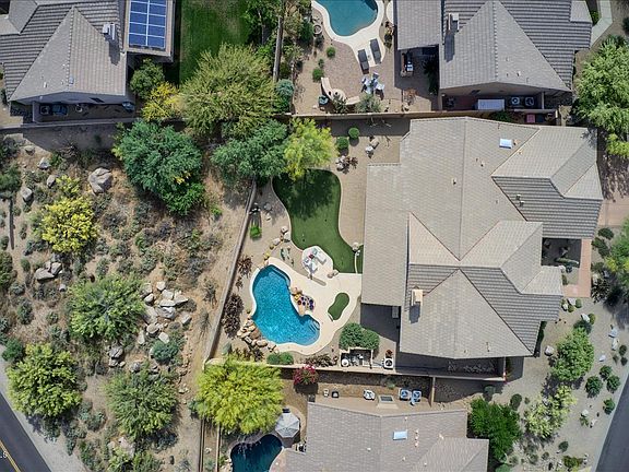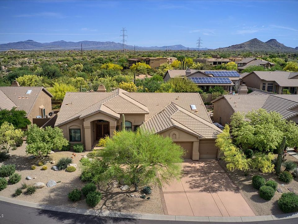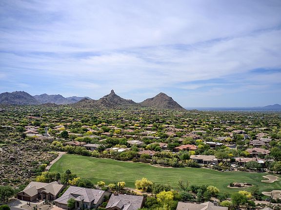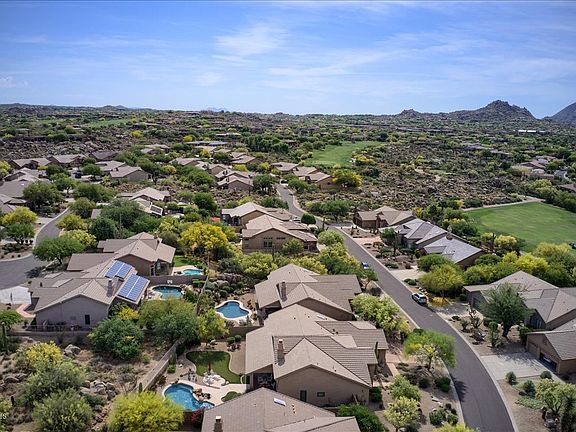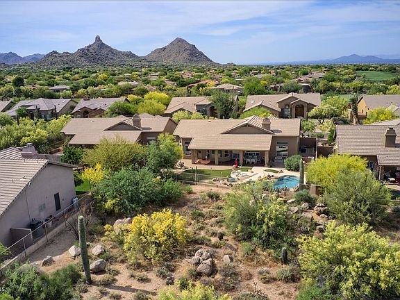 Immaculate single level home located in the Golf Course Community of Balancing Rock at Troon North featuring a 5 Hole Putting Green and Heated Pool with Water Feature perfect for relaxing after a round of golf summer or winter. Private north south exposure quarter-acre lot backing to beautiful natural desert open space, North facing backyard allows for year round use of patio and outdoor living area. The community of Balancing Rock is set among the boulder outcroppings of Troon North and surrounds the fairways of the famed Troon North Monument Golf Course. Light and bright living area with neutral color palette. Kitchen features Tigris Sand quartz countertops, backsplash, and eat at waterfall island, double wall ovens, and breakfast nook overlooking outdoor living area. Split floor plan