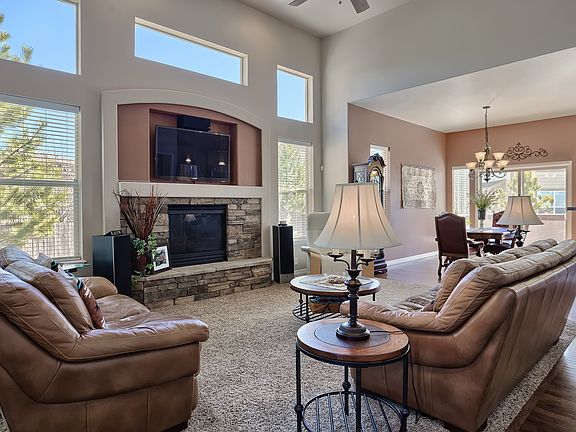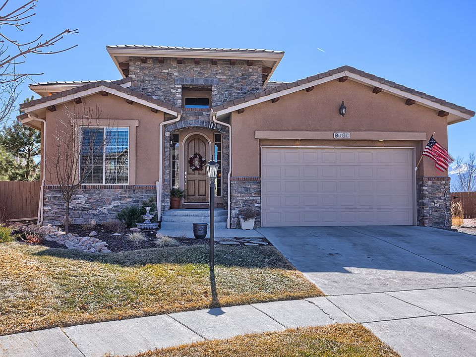 Main level living at its best! Beautiful ranch style stucco home featuring 4 bedrooms, 3 bathrooms, 2 car garage and over 3,700 square feet. This quality constructed home boasts an open floor plan on the main and lower level and includes custom upgrades throughout. The main level has beautiful hardwood floors, spacious living room with vaulted ceilings, cozy fireplace and is open to the dining area that walks out to the private patio. Open gourmet kitchen with granite countertops, stainless steel appliances, walk in pantry, Pikes Peak Views, ample cabinet and counter space. Unwind in the main level master retreat with a cozy 3-sided fireplace, walk in closet, sitting area with Pikes Peak Views and a luxurious attached 5 piece bathroom. The main level also includes a secondary bedroom that is currently being used as an office, full bathroom with beautiful tile work and a large laundry room. The finished lower level features a large family room, rough-in for a wet bar, 2 spacious secondary bedrooms with walk in closets, full bathroom and ample storage. Enjoy beautiful Pikes Peak views from every main level rear window, mature landscaping, privacy wall surrounding the backyard patio, hardwired security system on all doors and windows, mature neighborhood, quiet street, great location with easy access to shopping, dining, parks, schools and more!
