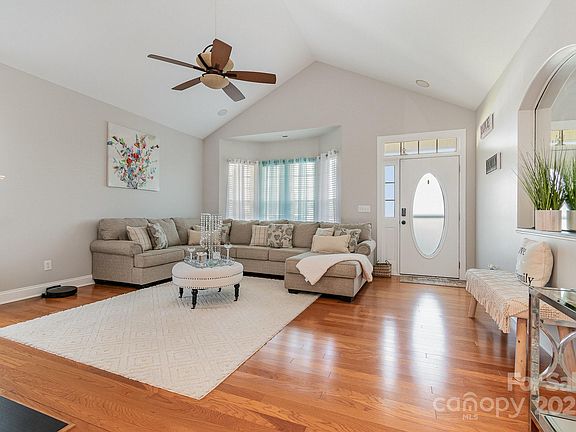 Motivated Seller Welcome to this spacious 1.5-story, 4-bedroom, 3-bath home located in the highly desirable Moss Creek community! Tucked away in a cul-de-sac, this home offers privacy and convenience. Just minutes from shopping, dining, and less than 10 miles from I-85 and Concord Mills Mall. Moss Creek features resort-style amenities including a community pool, tennis courts, and clubhouse. Both the elementary and middle schools are located within the neighborhood! The primary suite is located on the main level. Inside, you’ll love the beautiful hardwood floors, updated appliances, fresh neutral paint, crown molding, vaulted ceilings, and a stunning double see-through fireplace connecting the living and dining areas.
