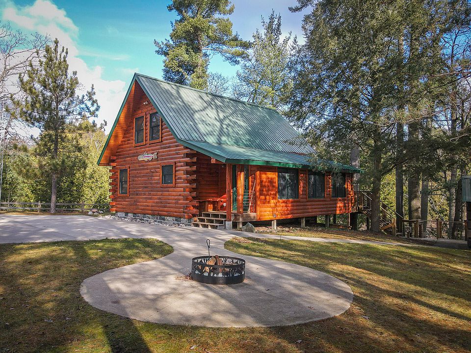 This beautifully crafted 3-bedroom, 2-bathroom log home, built in 2003, is situated on 480 feet of pristine river frontage in Irons, Michigan. The open-concept design features vaulted ceilings, large windows, and custom finishes throughout, including a cozy stone fireplace, with a custom mantle, and a spacious kitchen with handcrafted cabinetry.
