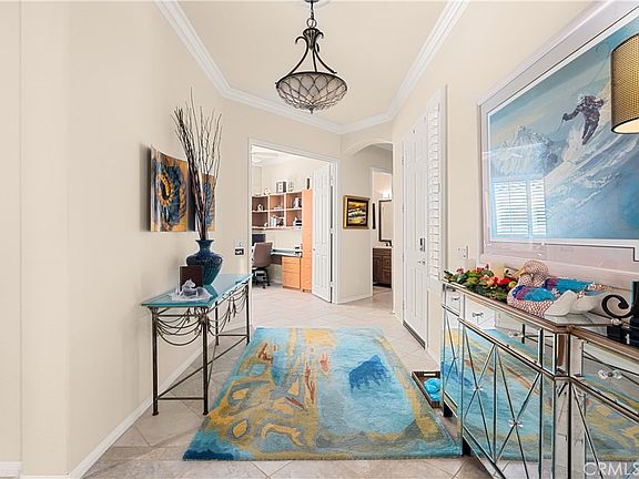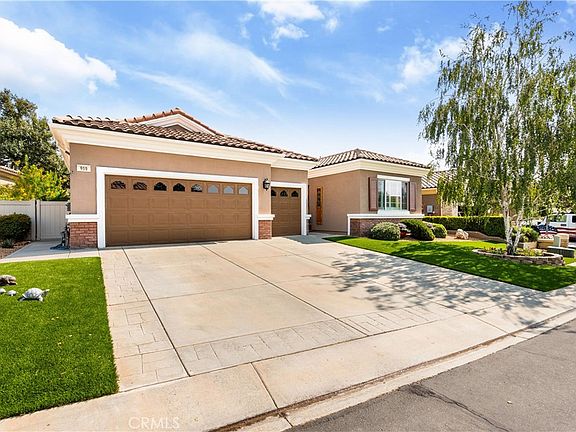 "Emerald" on the Golf Course with over $100k in Upgrades. NO MELLO ROOS (the bond has been paid in full)!!! NO ELECTRIC BILL (paid for Solar System)!!! Long list of Upgrades include: Freshly Painted Exterior, Tiled Floors thru-out with High Quality Carpet in both Bedrooms, Remodeled Kitchen with Granite Countertops/Backsplash and Custom Tiled Island Base, Crown Moulding thru-out, Upgraded Light Fixtures thru-out, Plantation Shutters thru-out, Remodeled Primary Bathroom with Tiled Shower, New Glass Enclosure and Plumbing Fixtures, Huge Organized Walk-In Closet w/ 3 rows of Shelving in Primary Bedroom (3 rows of shelving also in Guest Bdrm Walk-in Closet), Murphy Bed in Guest Bdrm stays, Powder Room has Newer Vanity with Granite Countertop, New Sink & Faucet, all Commodes have been recently replaced, Built-in Wrap-around Desks, Cabinets & Drawers in Den/Office, Ceiling Fans In Living Rm, Den and both Bdrms, New "Lennox" A/C unit installed less than 1 year ago, Garage has Epoxy Floors, Built-in Cabinets, Workbench and reinforced Shelving above the garage doors that extend across entire wall and continue along side walls, Pull-Down Ladder to access attic storage in garage, Aluminum Patio Cover spans across entire back of house, New Faux Sod in Front and Back Yards, Water Source Purifier System runs to all interior water faucets and is Owned (not leased), Upgraded Digital Thermostat, Phantom Screens on Front and Back Doors and Much, Much More!!! Additional Features of this popular Open Floor Plan are: Dual Primary Suites with Private Bathrooms and Walk-In Closets, 10' Ceilings, Oversized 6-Panel Interior Doors thru-out, Pull-Out Drawers in Lower Kitchen Cabinets, Double-Oven, Built-in Microwave, Dual Sinks in Primary Bathroom, Gas Fireplace in Living Rm with electric starter, Interior Individual Laundry Room with Pantry and Sink (Washer and Dryer Included), 2-Car Garage Plus Golf Cart Garage. Low HOA Dues include Internet and Cable TV too!! Solera is a 24-Hour Guard-Gated 55+ Community with many Amenities including: Clubhouse with State-of-the-art Gym, Pool, Spa, Tennis, Pickle Ball, Billiards, Bocce and many Clubs to join for those interested. Centrally located with a 40 minute drive to Palm Springs, 15 minute drive to Casino and Outlet Shopping Center, 45 minute drive to Big Bear and close to hospitals (Loma Linda, San Gorgonio, Redlands Community and Desert Memorial). Living here is like living in a Resort!!