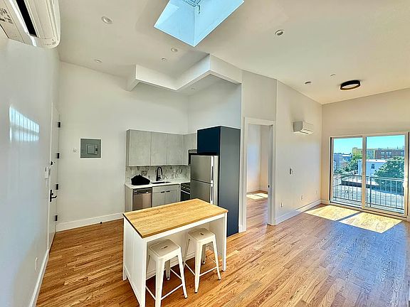 Giant, Newly Constructed 2 Bedroom 2 full bathroom with private terrace in the heart of East Williamsburg a block away from Cooper Park! In unit Dishwasher and stunning bathroom and kitchen finishes compliment generously proportioned sun filled rooms and an elegant layout. Open and spacious layout that seamlessly connects the living, dining, and kitchen areas with an abundance of natural light streaming in through the skylight and floor to ceiling windows of the sliding glass door opening onto your private terrace. The modern kitchen is equipped with top-of-the-line stainless steel appliances including dishwasher, stone counter tops and high end cabinitry. Both bedrooms are generously sized and feature large windows that allow for plenty of natural light. The master bedroom includes an en-suite bathroom for added convenience and privacy. In addition to the apartment's features, residents have access to a shared rooftop deck, providing breathtaking views of the Manhattan kyline. For added convenience, laundry facilities are available within the building. Located in the vibrant neighborhood of East Williamsburg, you'll have an array of dining, shopping, and entertainment options at your fingertips. This trendy area is known for its artistic flair, trendy bars, and diverse dining scene, ensuring there's always something new and exciting to explore. In summary, this brand new 2 bedroom, 2 bath apartment in East Williamsburg, Brooklyn offers a sunlit living space with a private balcony, shared rooftop access, and on-site laundry facilities. With its desirable features and prime location, this apartment is perfect for those seeking a stylish and convenient living experience in Brooklyn.