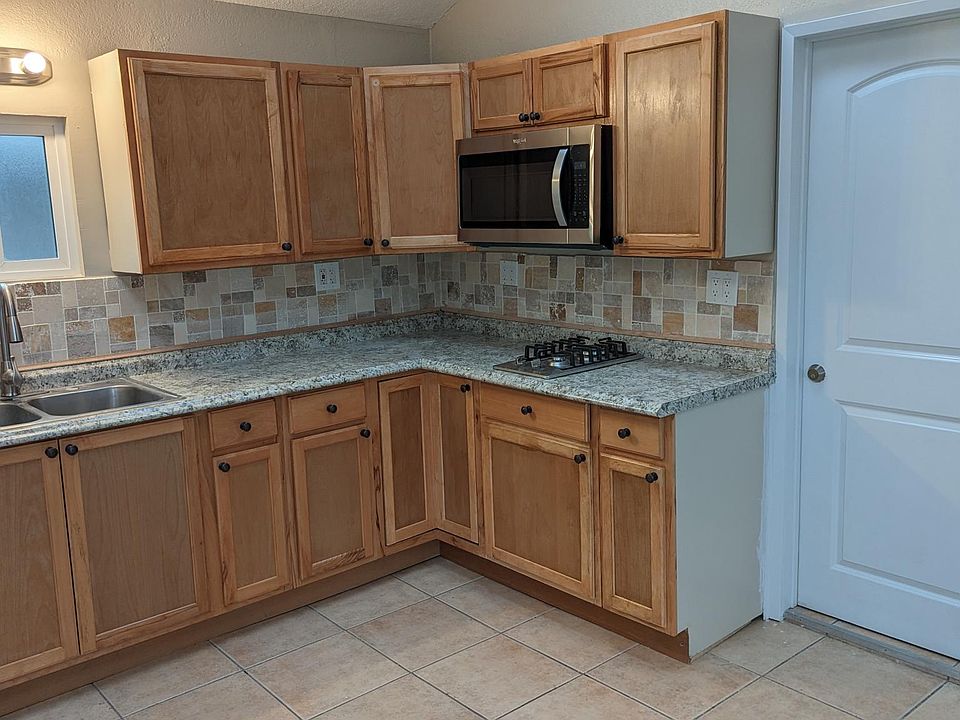 Junior one bedroom with newer kitchen cabinets and appliances. Includes Refrigerator, Large microwave, skylights, Ceiling fans, & bathroom heater. High Speed internet, onsite Washer & Dryer and AC available at extra cost. Private sliding glass entrance opens to back yard. Great for entertaining on warm summer nights. Firepit, BBQ and patio table shared with house tenants. Bedroom is 10' 5" x 8' 8" and will comfortably fit a double bed (54" wide). Kitchen / Living area is 12' 6" x 15' and will fit table, coffee table, chair, and couch. Perfect for one or two people.