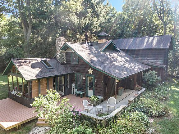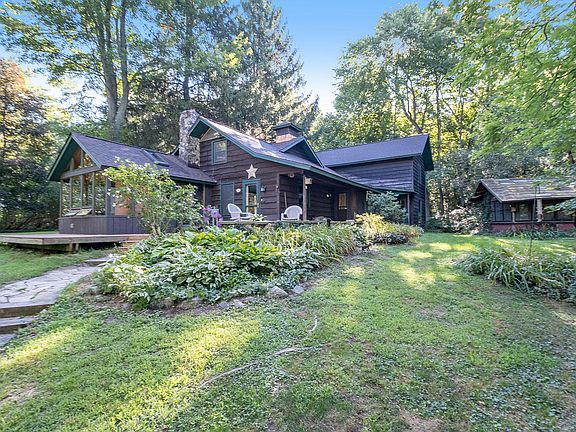 Barely visible from the road. If privacy, Seclusion and nature are important to you, then this one of a kind property is a must see! Definitely a style of it's own! Nicely updated through the years! You'll enjoy the 3 seasons room along with the 2 decks and porch. Updated and fully equipped with all appliances staying, main floor laundry, large formal dining room, main floor bedroom, updated full bath and french doors that lead to an enormous living room boasting nearly 3 walls of windows makes you feel like you are outside! Upstairs are 2 additional bedrooms one of which feels like a tree fort along with an updated full bath and 2 areas for offices or study! Another thing to LOVE are the 24x32 garage and 24x40 workshop with heat and electric in the shop. Nicely landscaped with perennials!