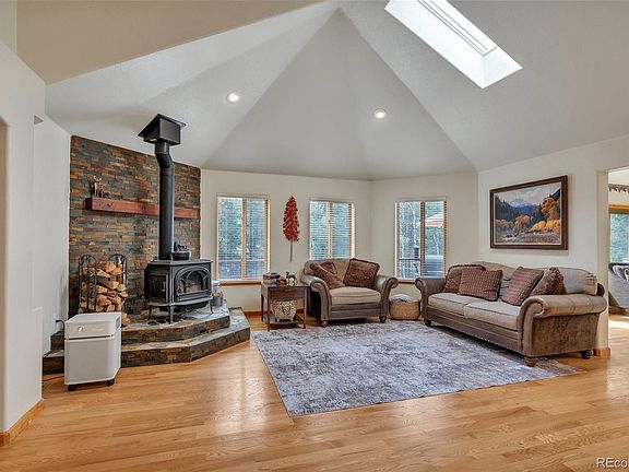 Welcome to 9590 S Warhawk Rd – an updated mountain retreat nestled on 2 private, wooded acres in the highly sought-after Evergreen Meadows - West neighborhood. Offering a perfect blend of comfort, convenience, and Colorado mountain living, this home is located on a school bus route for priority plowing and lies within a top-rated school district. Inside, you’ll find a beautifully remodeled kitchen featuring a high-end Viking gas stove and double oven—ideal for any home chef. The luxurious primary suite boasts a spa-like bathroom with a Mr. Steamer shower and radiant heated floors, creating a true retreat. Enjoy cozy evenings by the wood stove or step outside to unwind on the spacious two-tiered TREX deck, surrounded by mature trees and serene mountain views. The property is wired for a spa, includes a fenced dog run, and offers a large wraparound driveway with ample space for RV parking. Bonus features include 50amp service in the shed and 220v in the shop—perfect for hobbies, tools, or outdoor gear. This is your chance to enjoy the peace of mountain living with the convenience of modern updates and easy access to Conifer and Hwy 285.