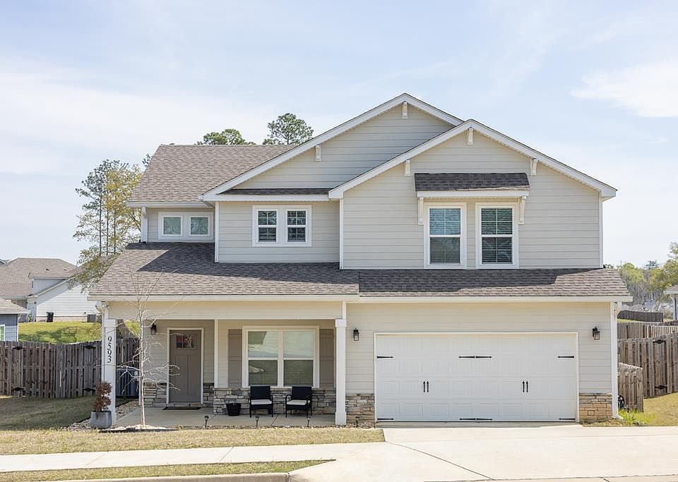 Welcome to 9593 Capot Dr, nestled in Midland Downs. This two-story home offers unparalleled lakefront living, boasting exclusivity as the sole available property on the lake. Built just three years ago, it ensures peace of mind with modern amenities. The kitchen dazzles with quartz countertops, while the outdoor game day porch invites relaxation and stunning lake views.