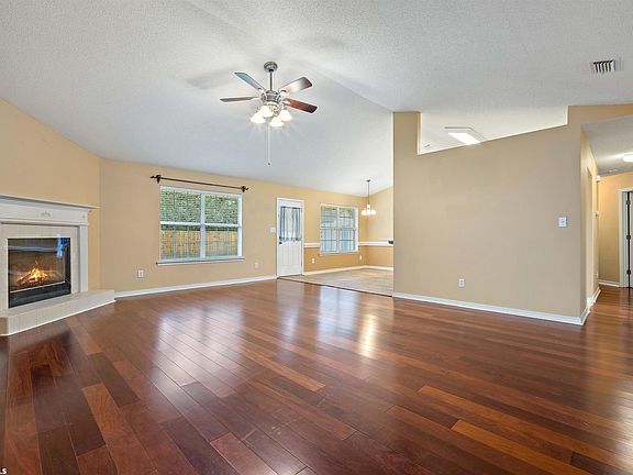 USDA 0% DOWN ELIGIBLE!! 3 Bedroom 2 bath brick home in highly sought-after West Mobile area. Hardwood floors throughout most of the living space. Master ensuite has garden soaking tub, separate shower, double vanities but separate, and tile floors. Tile floors in the kitchen and laundry room. Crown molding and wainscoting detailing in formal dining room, Breakfast area plus bar seating. BONUS FLEX SPLACE can be used as separate office. Living room has vaulted ceilings and gas start/log fireplace. Large privacy fenced back yard with a storage shed. Custom cut boards to fit all windows and doors for hurricane protection. Refrigerator to remain at no value.
