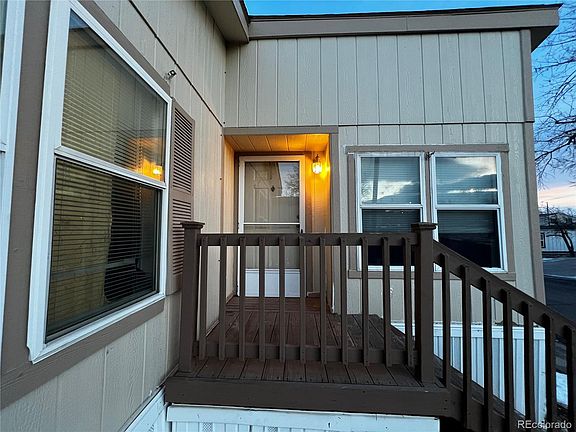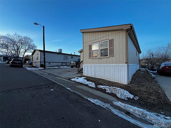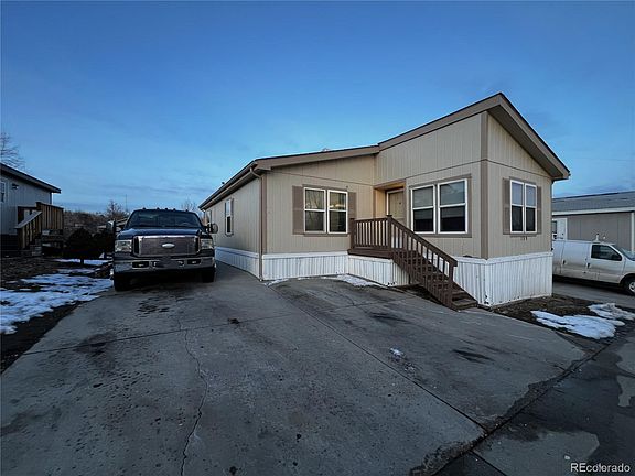 This beautifully updated mobile home is ready for you to call home. Perfect and affordable for first-time home buyers. As you step in, you’ll be greeted by the spacious living room with gray vinyl flooring throughout. The updated kitchen offers beautiful white shaker cabinets with laminate countertop, gas stove and vented microwave. The laundry closet is adjacent to the dining room with glass door access to the back patio where you can enjoy the beautiful Colorado mornings. Large extended cement driveway where you can park 3 vehicles. Community amenities include clubhouse, park, playground, and pool. Perfect location, close to shopping, schools, highways, and everything you need! This home will not last! Schedule your private tour today!