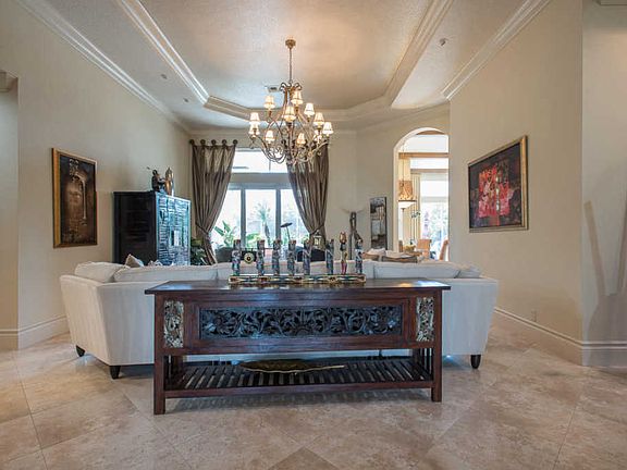 This Stresa model is one of the largest homes in Bellaggio on a private pie shaped lot. Enjoy Breathtaking lake views overlooking a Preserve from your screened and heated, saltwater pool/spa with remote controls at your fingertips or just relax on your covered patio. On either side of the screen are areas to BBQ or sit in the sun. Enter your home through custom impact glass doors to beautiful diagonal porcelain tile floors with designs in the foyer and dining room. The living room has tall, coffered ceilings and crown molding. Look out to your backyard oasis through impact glass sliders. The Kitchen looks like a magazine cover with stunning granite counters, including the large island, hand cut onyx backsplash, and elaborate cherry wood cabinets for tons of storage.