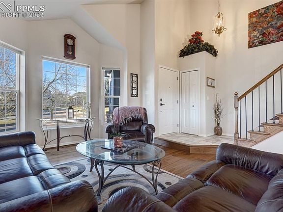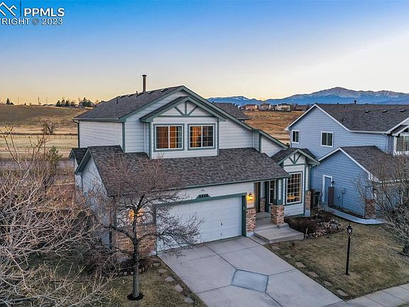 Welcome Home! This meticulously cared for Campbell built home in the GREENMOOR Enclave of Pine Creek offers five large bedrooms three full size bathrooms and a half bath on the main level. As you enter the home you are greeted by vaulted ceilings and hand scraped wide plank hickory hardwood floors in the living room and dining room. Picturesque views of Pikes Peak are enjoyed from the dining room through the kitchen to the family room in this open floorplan design. The kitchen boasts imported Brazilian granite countertops specifically designed for this kitchen (notice the pattern), plenty of storage space, a black undermount granite sink, and upgraded black stainless steel LG appliances compliment the kitchen design. The gas fireplace and the hand scraped wide plank hickory hardwood floors in the family room give you the comfy cozy feeling of home. Entertain with ease in the extra large walkout basement perfect for a game of pool, you can even see Pikes Peak from down there! In the back yard, the extra large deck and patio give you plenty of space for those weekend barbecues and to enjoy those unobstructed mountain sunsets. Who doesn't love an extra large primary bedroom with 5 piece ensuite after a long day, views from there too! With this home you get lots of extras including two 50 gallon water heaters, new exterior paint (Oct '22), roof tune up (Oct '22), concrete patio resurfaced (Oct '22), newer carpet with upgraded pad, soft close cabinets, Brazilian granite counters in all the baths, upgraded plumbing fixtures throughout, wrought iron balusters on the staircase, the list goes on and on. The oversized 2 car garage gives you plenty of room for all those tools. This home has easy access to everything from parks, trails, golf, shopping, restaurants, I-25, and the hospital. D-20 Schools! Set up your private showing today!