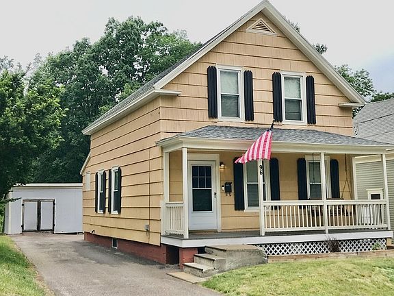 Nicely updated, well maintained, cozy, three bedroom, move-in ready home with bonus room. Renovated kitchen with island for seating that also includes extra cabinets and shelving for storage, decorative tile backsplash at sink area, granite countertops and tile floor. Good sized living room and dining room for family and friends to enjoy. Freshly painted first floor. Convenient laundry room with shelving, and mud room area at back entrance for shoes and coats. Upstairs has three bedrooms, with a bonus room that could be an additional bedroom or office space (no closet in bonus room), all with beautiful hardwood flooring. Air conditioned with new split system. All windows are replacement windows. Front farmers porch has a swing and new composite decking for outdoor relaxing. Level backyard is fenced for safety of children or pets, with a large storage shed including electricity. Conveniently located nearby Cider Mill Park Conservation land, Apricot St Playground, and all area amenities.