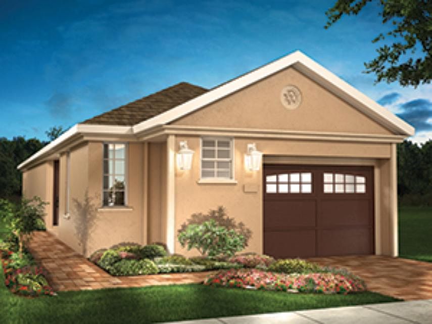 The Amalfi takes after the sun-drenched Italian coastline that inspired its name, offering front and rear courtyards that take advantage of the beautiful Florida weather. A narrow courtyard leads visitors back to the home's entry. Step inside to the comfortable living room, kitchen, and dining room, an open-concept area that makes excellent use of space and instantly makes you feel at home. The generous kitchen island with built-in sink and dishwasher is an effortless hub for entertaining guests. Set out cocktails and appetizers as friends and family move from the island barstools to mingle about. This entire living space overlooks the side patio, which is just the right size for an additional dining table and loveseat. Add optional triple sliding glass doors to the living room/dining room wall and you can truly expand your living space, letting the breeze flow through your home on temperate days. Just off the kitchen/dining area is the master suite, a relaxed and inviting escape that you'll appreciate day and night. Start your morning with a cup of coffee in the attached covered patio that leads into Amalfi's backyard, which wraps around the side of the home. An alluring walkway and landscaping join the two outdoor spaces. At the end of the day, pamper yourself in the exquisite master bathroom, which boasts dual vanities, a spacious shower, and a walk-in closet. At the front of the home, a second bedroom with nearby bathroom is the ideal retreat for guests visiting for th