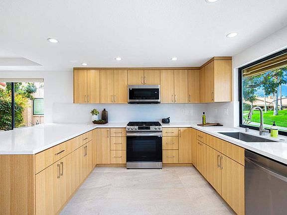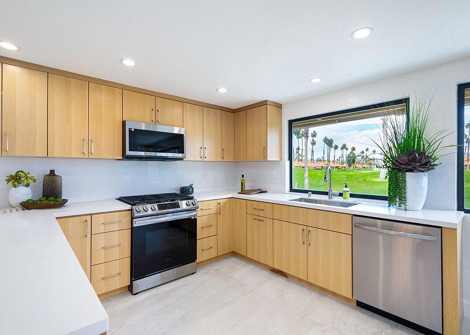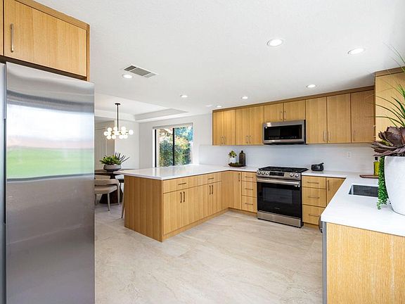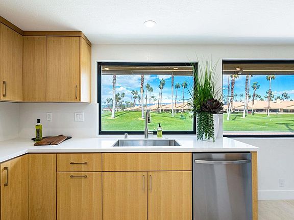 STUNNING REMODEL! The most popular 3BR/3BA floor plan has been renovated top to bottom.OPEN KITCHEN with quartz countertops, Samsung stainless appliances, gas stove and farm sink. MODERN large slate tile flooring throughout and state-of-the-art cabinetry. GORGEOUS, WIDE FAIRWAY VIEWS from the extended patio with pony wall and motorized awning. Wet bar with wine fridge. ENCLOSED ATRIUM WITH SEE-THROUGH FIREPLACE makes for a great den or 3rd bedroom. Seller will add doors for privacy at Buyer's request. BEAUTIFULLY UPDATED BATHS with custom tile and glass enclosures. Finished ceiling in garage with painted floor and cabinets. Just a few doors from the pool.NO EXPENSE SPARED! Furniture is available for purchase outside of escrow. Ask for price list.