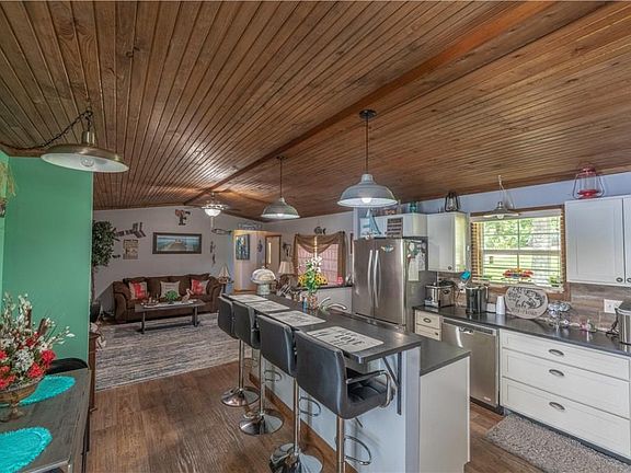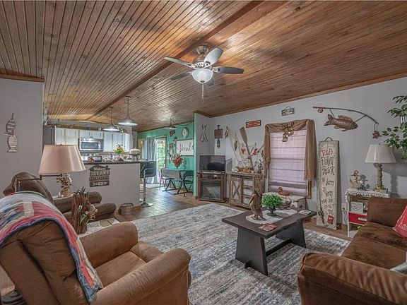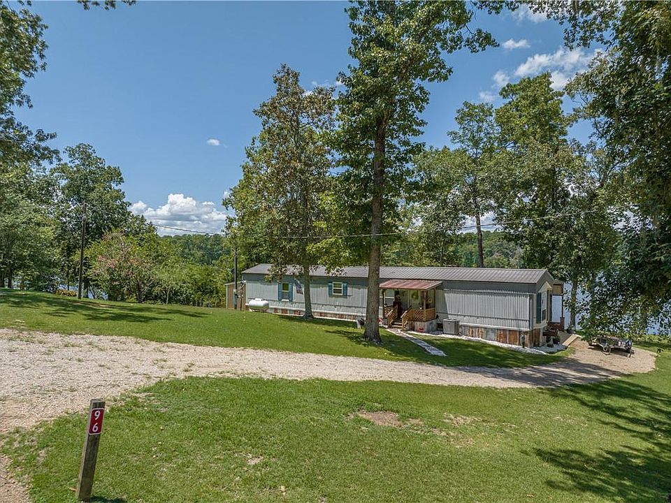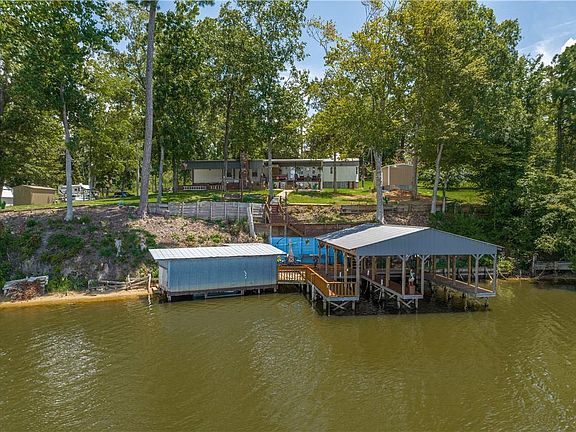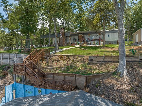 Stunning waterfront camp with 200 ft water front located on Cotile Lake with boathouse and covered boat dock with lifts. Beautiful staircase leading to the boat dock with a lower deck for entertaining. This is a manufactured house with a large deck off the back with a half bath. There are two metal storage buildings a 10 x 20 & 8 x10 with one setup as a shop.