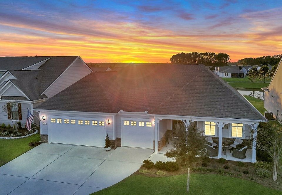 This Stardom model is a true showstopper with its picturesque golf course, lagoon, and bridge views. The peaceful cul-de-sac location & proximity to amenities make it a prime spot. Inside, the Craftsman trim, laminate flooring, trey ceilings & thoughtful lighting create an inviting atmosphere. The kitchen, complete with KitchenAid appliances & a spacious island, opens to a covered screened porch for entertaining & taking in gorgeous Lowcountry sunsets. The owner’s suite features a luxurious zero-threshold tiled shower & a roomy walk-in closet. With a covered front porch & custom outdoor patio, this home effortlessly blends style and comfort