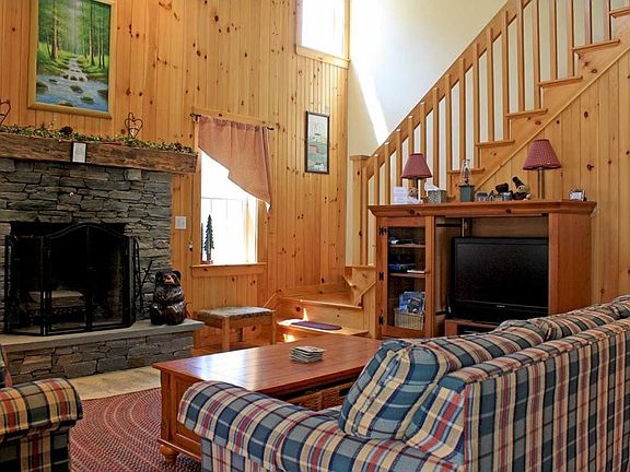 Lakes Area Beauty: Nestled in a private wooded setting, this cute Adirondack home is inviting inside and out. The location is key, within a walk to deeded shared right-of-way to Echo Lake and only a few minutes drive to Plymouth State Park, Okemo and Killington. The open floor plan features cathedral ceilings and a beautiful stone faced fireplace where everyone can cozy up with friends after a day of skiing. A master suite on the main level offers convenience and his/her closets leave plenty of room for gear and clothing. Two spacious bedrooms upstairs offer optional sleeping configurations. A large lower family room has space for many possibilities, it could fit both a TV viewing area and still have room for a ping pong table and more. The kitchen is well designed with granite counter tops and conveniently opens to the dining area. This home is planned for year-round fun . . . sit out on the covered front porch or enjoy a lower side deck perfect for a fire pit and chairs.