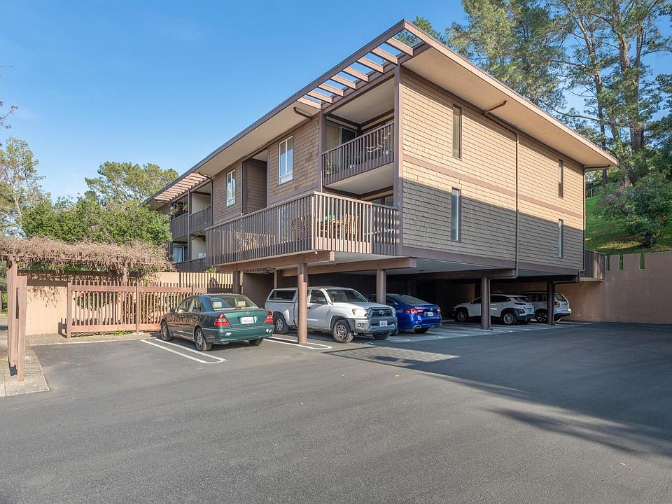 Private, serene, and sun-filled, this beautifully positioned residence enjoys the rare benefit of no shared side walls and exceptional privacy. Located one story above the carport, the unit features covered parking, a private laundry and storage area below, and convenient access via a covered walkway. One of only a few units in the community to offer an oversized front deck, this home invites you to dine, relax, and take in golden sunsets in a peaceful, elevated setting. A second outdoor living space is a generous rear patio off the second bedroom which offers tranquil views of surrounding nature and open space. The open-concept floor plan seamlessly connects the kitchen, dining area, and living room, all overlooking the sun-drenched front deck, creating an ideal layout for both everyday living and entertaining. The spacious primary suite features two closets, a dedicated dressing area, and an en-suite bath. Set on over 20 acres of lushly landscaped grounds, the community offers true resort-style amenities including a clubhouse, three swimming pools, two tennis courts, EV charging stations, and scenic walking and biking paths. Perfectly located near award-winning Miller Creek schools, Scotty's Market, popular restaurants, and with direct access to Terra Linda-Sleepy Hollow Open Space, this home offers the ultimate blend of comfort, convenience, and resort-style living.