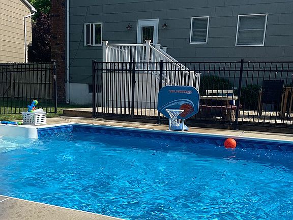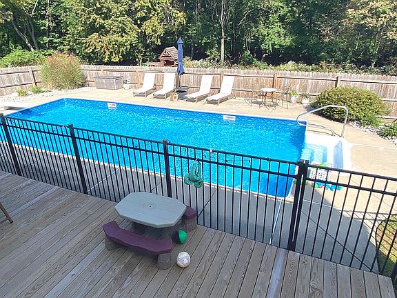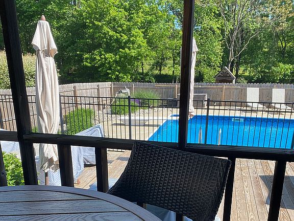 A fully fenced in (new wood fence in 2018) large back yard with large deck, newly resurfaced in 2021, runs the full length of the house and then some, wrapping around to meet the screened in, raised side porch. Right off the house, a raised trex back porch/deck leads you to the large built-in pool with a new liner (2019) and a new sand filter and motor (2020), complete with a safety fence with 2 convenient gates. Lots of space for lounge chairs, umbrellas and even a few cocktail tables right by the pool.