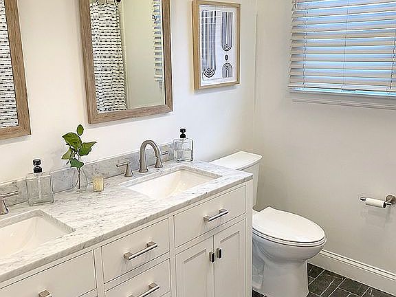 Upstairs the large master bedroom has enough room for a casual sitting area, hardwood floors with an en-suite with stand-up shower, 2 large closets and south facing windows that let in generous natural light. The second floor also features 3 more generously sized bedrooms, all with hardwood floors and a newly (2021) and fully renovated full hall bath with his and hers sinks.