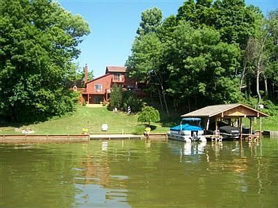 The perfect spot on the lake! This 2400 SF 2 story home w/ the full finished walkout bsmt is located on two prime waterfront lots in the very desirable no wake area on the main lake. Enjoy panoramic views from the upper deck, 3 bedrooms, the kitchen, lvrm, & the family rm in the lower level. The upper deck is 44' long & 20' wide & is surrounded by beautiful landscaping & a hillside water fall. On the two tiered upper deck is a new thermo spa hot tub to enjoy in the evenings overlooking the lake. The custom blt boat house is extra large & set up for your boat and jet ski w/ top of the line electric boat lifts. Beautiful private beach at the waters edge. 3 Car garage w/ one bay at 26' deep for boat storage. 10x12 interior shed behind the 10x12 covered screened in porch. Two balconies off the upstairs bdrms. 1st flr Owners Suite with beautiful lake view & new bath. Great for entertaining with the Family Room & Rec Room in the walkout.
