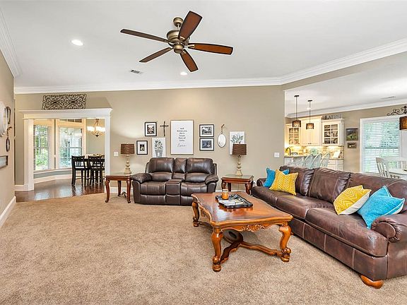 Inside the gated community of Sanctuary Cove, you will find your own personal sanctuary in this a 4 bed/2.5 bath home. From the tiled front porch through the gorgeous wood & glass doorway you will find hardwood throughout the foyer, dining room into the kitchen. The kitchen features stainless steel appliances, granite countertops, brick back splash with custom cabinetry and large walk-in pantry w/ shelving. The breakfast bar and breakfast area give plenty of dining options. Primary bedroom is very spacious with an en suite featuring double vanities, walk in tiled shower, soaking jetted tub and a huge walk-in closet. Split bedroom floor plan has two additional bedrooms connected by a 4th bedroom or home office/study. Beautifully screened in back porch has an outdoor kitchen including a gas grill, tongue & groove ceiling overlooking the landscaped back yard. A few upgrades include, the garage is fully insulated with foam in the roof, the ceiling and walls. AC is upgraded to variable speed unit. Sanctuary Cove has wonderful amenities including pool and tennis courts.