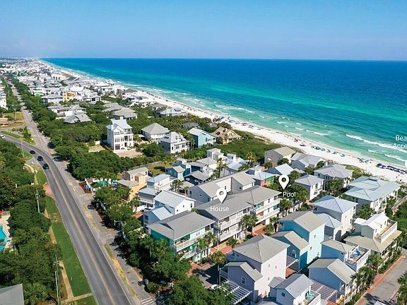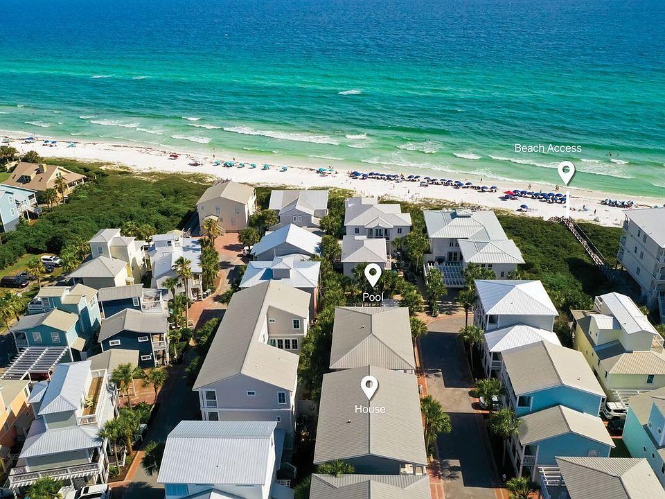 Steps from the pool and beach, this spacious five-bed home is on a quiet private street within a small gated community located in the heart of Seagrove Beach. The experience can't be understated, situated two homes from the community pool and 4 homes from the communities private beach access. At the entrance you're greeted with a spacious foyer; a great place to drop bags, beach gear and flip flops before heading upstairs. Also on this level, there's an icemaker, laundry and a tastefully decorated guest suite reveling in its own peace and privacy. The ensuite bathroom is well-appointed with dual vanities and a tub/shower combo. The second floor boasts an open living room, kitchen, and dining area. Coastal decor in muted shades enhances this homely space. White kitchen cabinets, granite countertops and stainless steel appliances provide everything you need to create quick snacks and healthy family meals. The primary suite is conveniently located on this floor and has direct access to a wood-decked wraparound porch for quiet reading or savoring a cup of coffee. The third floor has two more guest suites, both enjoying large private bathrooms, porch access and views of the shimmering Gulf of Mexico. Rounding off the accommodations, a bunk room provides a great space for youngsters to sleep and hang out. A wet bar with refrigerator and sink is thoughtfully located on this top floor. Plan your days around the community pool or head to the private beach access just a few steps away. To top it off, the home offers two covered parking spaces. The gated community of Seashore Village is popular with permanent residents, second homeowners and vacation rentals due to its prime location. Restaurants, supermarkets and entertainment are within easy reach at Seagrove, Alys Beach, and Seaside. Point Washington State Forest offers plenty of outdoor recreation and neighboring Deer Lake State Park has hiking trails and one of 30A's rare coastal dune lakes to explore.