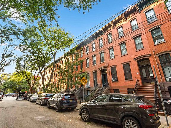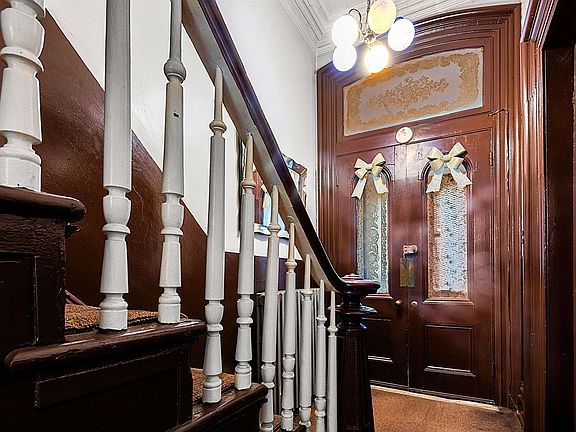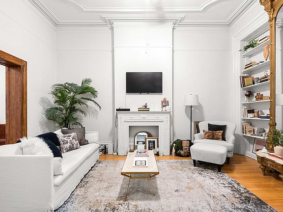 The stately facade with its gated front patio and classic stoop leads to an interior alive with original craftsmanship. Four solid marble fireplaces and a hand-carved wooden mantel anchor the living spaces. Crown moldings, ceiling medallions, tin ceilings, and intricate plasterwork add historic character, while winding bannisters, hardwood floors with ornate inlays, arched entryways, French doors, exposed brick, skylights, and pristine floor-to-ceiling windows, shutters reflect Victorian elegance. Double pier mirrors further enhance the parlor level’s dramatic sense of space.