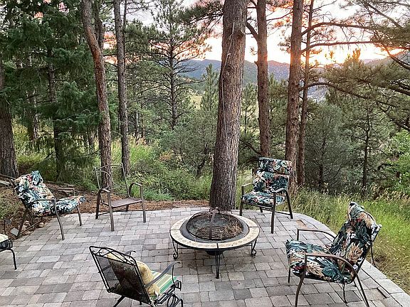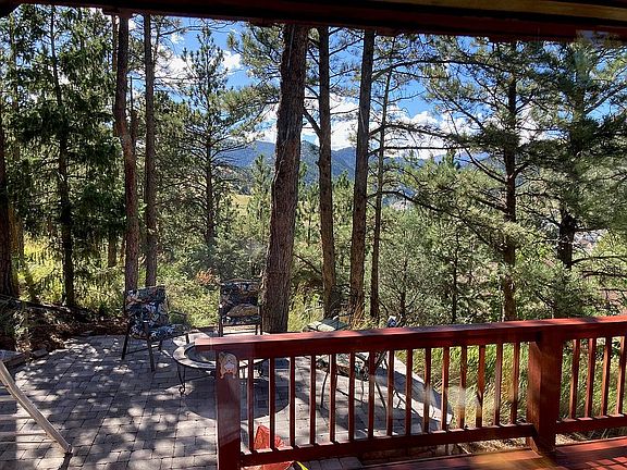 Refinished deck and brick patio beneath the tall pine trees, with snow-capped Continental Divide views. Also, canyon views that feature local public foothill parks and rocky cliffs in the distance.