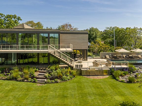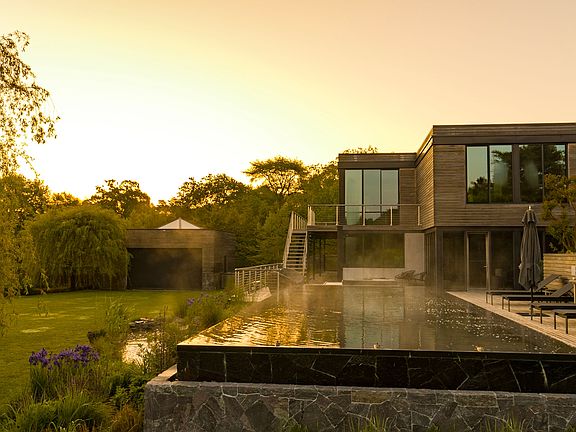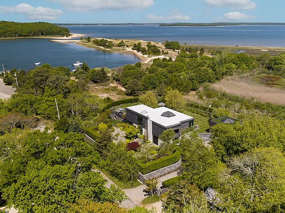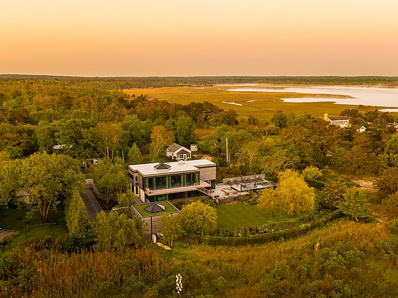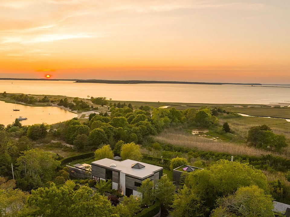 Privacy, views and a work of art are best words to describe this East Hampton gem. This bespoke modern boasts breathtaking views of the west-facing sunset and the tranquil waters of Northwest Harbor and Cedar Point Lighthouse. Built with a meticulous eye for detail by Trunzo Builders in 2018, this home is an architectural marvel, made with only the finest materials, including radiant poured concrete floors, steel beams and stone, which give way to soaring ceilings and walls of floor-to-ceiling windows and doors. The open main level of the home is bathed in natural light, casting a warm and inviting glow over the spacious interiors. The kitchen, a chef's dream, is fitted with granite countertops, custom cabinetry, and top-of-the-line appliances, making it the ideal place to create and enjoy culinary masterpieces. The living room, with its gas fireplace, hidden TV, and built-in bookcase, is a cozy and comfortable space to relax and entertain guests. The main level also includes a large dining room, powder room, and elevator. The primary bedroom, a true retreat, is concealed behind the bookcase and features built-in closets, a custom dresser and TV. The large en-suite bathroom has a soaking tub, shower, and multiple vanities. The first floor also boasts three additional en-suite bedrooms, a spacious office, and a gym, ensuring that everyone in the home has a private and peaceful space to call their own. Step outside to the screened porch, and be transported to a world of peace and serenity. Overlooking the infinity edge pool, beautiful gardens, and a tranquil koi pond, this is the perfect place to unwind and bask in the breathtaking views. The property also includes a built-in grill, fire pit, outdoor shower, 2-car detached garage, top-of-the-line landscape lighting, and outdoor dining table, making it the ideal space for outdoor entertaining. This home is a true work of art, a harmonious blend of beauty, comfort, and functionality. It is a once-in-a-lifetime opportunity that simply must be seen to be fully appreciated