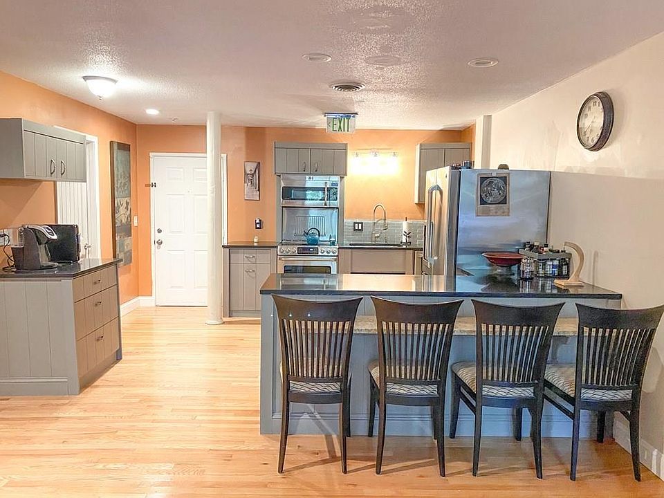 - Kit Dscrp: Flooring - Hardwood, Countertops - Stone/Granite/Solid, Breakfast Bar / Nook, Recessed Lighting, Dining Area, Stainless Steel Appliances, Open Floor Plan, Remodeled, Lighting - Pendant