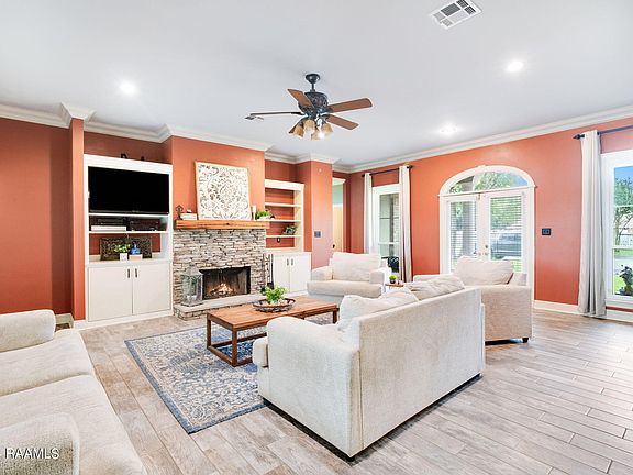 Step into this gorgeous home in the sought after Settlement subdivision! Central to everything on the southside of Lafayette, this 5 bed 3 bath property has a rare quad split floor plan. The kitchen is complete with an apron sink, decorative vent, and a massive island that can seat 4 comfortably. Wood grain ceramic tile throughout the entire home. On one side of the living room you will find an oversized master that has a large tray ceiling with cove lighting embedded in it, dual walk-in closets, and an expansive master bathroom with double vanities, jacuzzi tub, and separate shower. On the opposite side you will find 2 bedrooms with a bathroom between them. Towards the front of the house is the fourth bedroom and on the backside of the kitchen you will find the fifth bedroom with an adjacent bathroom along with an oversized laundry room. As you walk into the backyard you are greeted with palm trees, privacy, and an inground gunite pool with an attached jetted hot tub. There is a gazebo in the corner with electric, water, and cable ready for crawfish boils and football games. This is a beautiful home that is ready for its new owners.