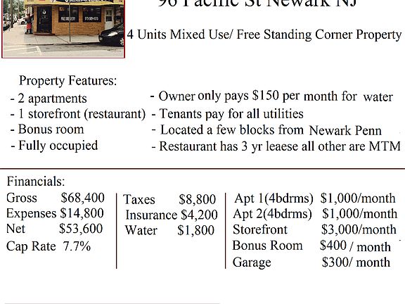 Income generating and mixed use building located minutes away from Newark Penn. Fully occupied with 3 units and a bonus unit. Tenants pay for all utilities. Net Operating Income: $53,600 Expenses: $14,800 Cap Rate: 7.7% Purchase is available as a package deal with 143 Catherine Street Elizabeth 702-708 Jackson Street Elizabeth