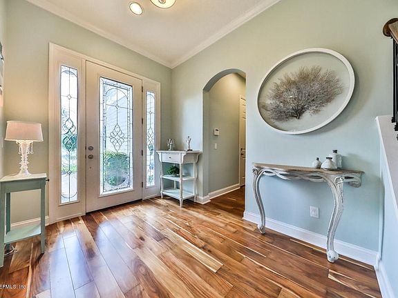 Coastal Oaks Pool Home at Nocatee is ready to enjoy luxury living in gated community. Customized Stonebrook floorpan was the former Model home with abundant designer upgrades & features throughout! From the moment you walk through the front door, the wood floors create the setting for a Coastal Elegance. Every inch features specific details like abundant lighting, crown molding, coffered ceilings, surround sound system, builtins etc. Custom storage systems in closets and garage, summer kitchen @ pool, tropical landscaping surrounding the screened lanai. A 5th bedroom is possible @ Bonus.Located on private preserve homesite walking distance of the clubhouse, fitness center, playgrounds, sport courts and nature trails of this exclusive community plus the extensive Nocatee amenities & shops!