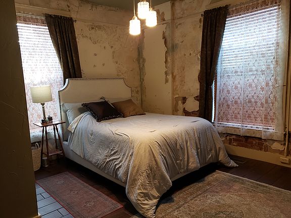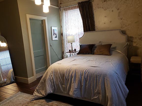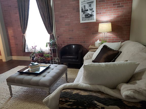 Beautiful Newly Renovated fully Furnished 1 Bedroom Apartment in Beautiful Downtown Buffalo Wyoming. This apartment is in the Historic Baker building on Main Street built in 1910. This is an upstairs North East apartment with views of the Big Horn Mountains, City Park and Clear Creek. Fabulous Cherry Tile Floor thru the three rooms and historic Black & White tile in bathroom. Completely new kitchen. This apartment includes sofa, 2 barrel chairs, 2 red leather chairs, side tables, smart TV, coffee table & lamps in living room; island with 2 bar stools, bistro table with 4 stools, storage cabinet, glass top range and refrigerator in kitchen; queen size bed with headboard and two side tables, mirrored side tables, 4 drawer dresser and lamps in bedroom; bathroom has a new vanity with tub/shower. Wood blinds and curtains on all the large windows. This apartment is fully furnished with bedding, towels, dishes, pans, everything you need, just bring your clothes and you are set. There is street parking with limited off street parking. There are three other apartments on the same floor. This is a FULLY-FURNISHED apartment, including linens, dishes and beautiful decor. All you need is your clothes and personal items. The $1150 rent includes heat, a/c, lights, water, sewer, trash and internet. A security deposit of $1000 and a non-refundable cleaning deposit of $250 is required with first month's rent. This is a NO smoking building. This is a minimum 6 month lease. Owner of building owns a retail store downstairs. There is parking behind the building, on street parking or parking across the street in the bank lot. Washer & Dryer shared by tenants upstairs. This is a second story unit with 30 steps up to the apartments.