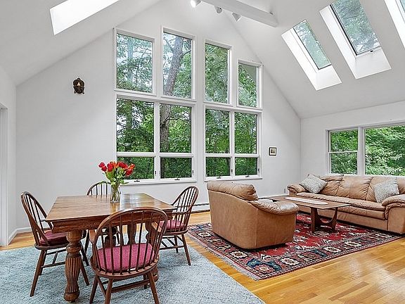 The Concord’s Conantum area, a coveted family neighborhood, was created on 190 acres next to the Sudbury River. The home is a classic Conantum A-Frame design with 3 stories, 4 bedrooms and separate garage. With newer windows this mid-century modern home is set on a hill amongst beautiful gardens, walkways, decks, greenhouse and stone walls. The home is sun-filled through large picture windows, skylights and sliders. The main floor has an easy-to-work-in kitchen, great room with eating area, cathedral ceiling and access to the great outdoors plus an airy family room with fireplace as well as a mudroom. In the wing off the living area are two family bedrooms and bath. The principal suite, on the upper level has a bathroom with walk-in shower and an office. The lower level has large guest room, exercise room, bath, laundry, and amazing workshop. This property has endless possibilities for a couple or family looking for a unique home in a private setting with naturally landscaped grounds.